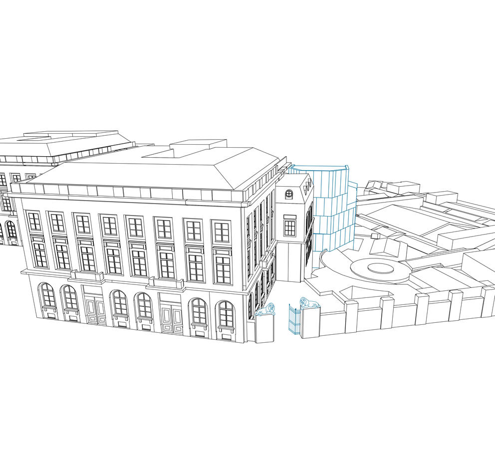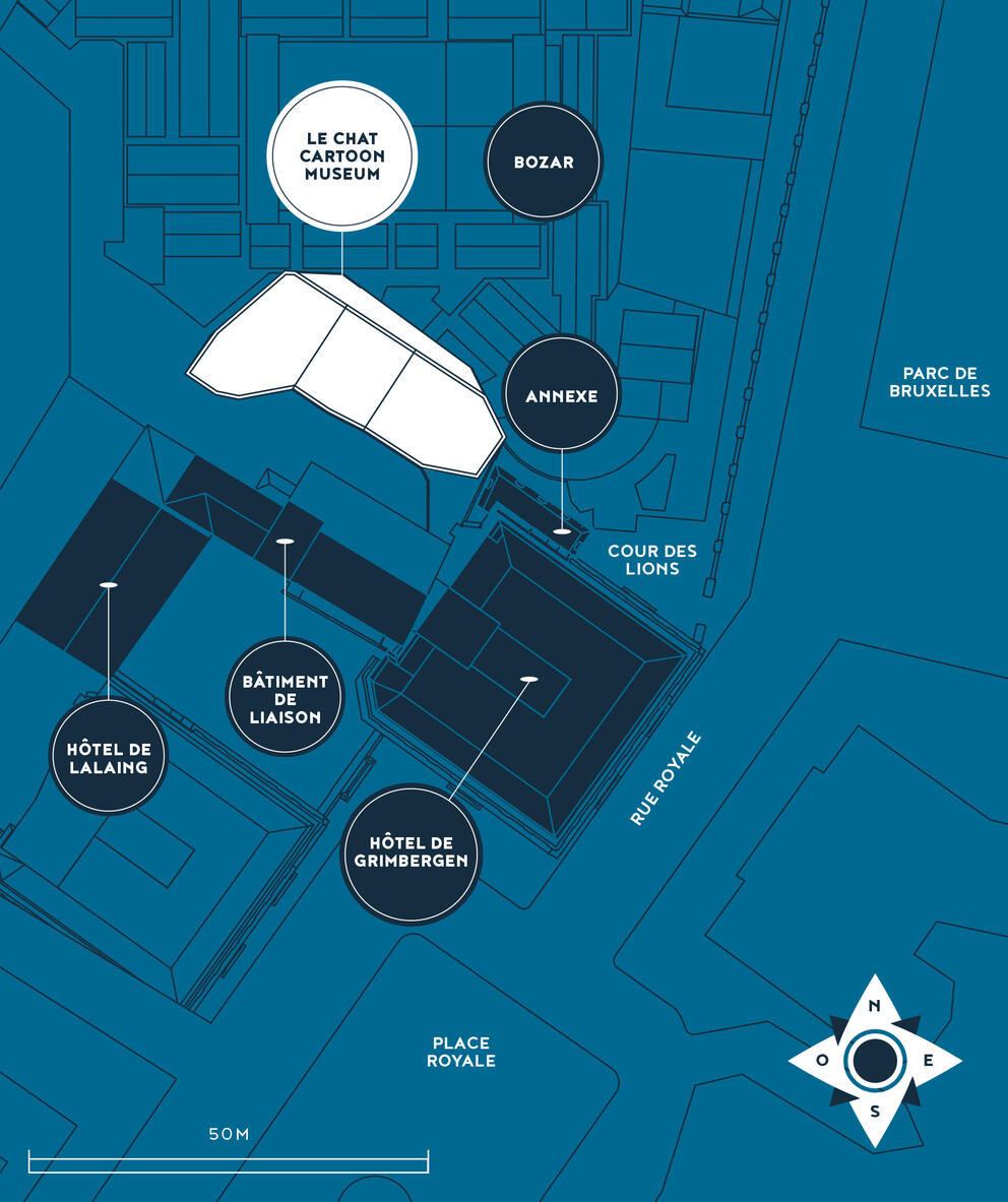 LE CHAT cartoon museum occupera quelque 4.000 m2 de surfaces brutes sur 7 étages, dont 4 hors sol. Cette nouvelle institution culturelle sera, une fois construite, accessible via le portail ceint de deux lions du 6 rue Royale, l’entrée de la Cour des Lions du Bip.