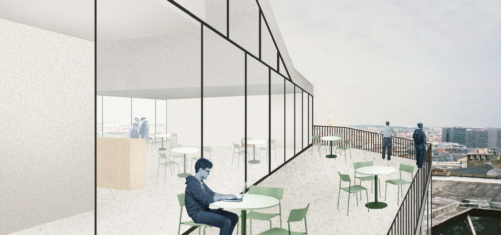 La Société d’Aménagement Urbain y érigera un immeuble contemporain, modulable, dans le respect du patrimoine voisin. Conçu par l’architecte Pierre Hebbelinck, il a fait l’objet d’une concertation étroite avec les Monuments et Sites, l’asbl Mont des Arts et les institutions mitoyennes.