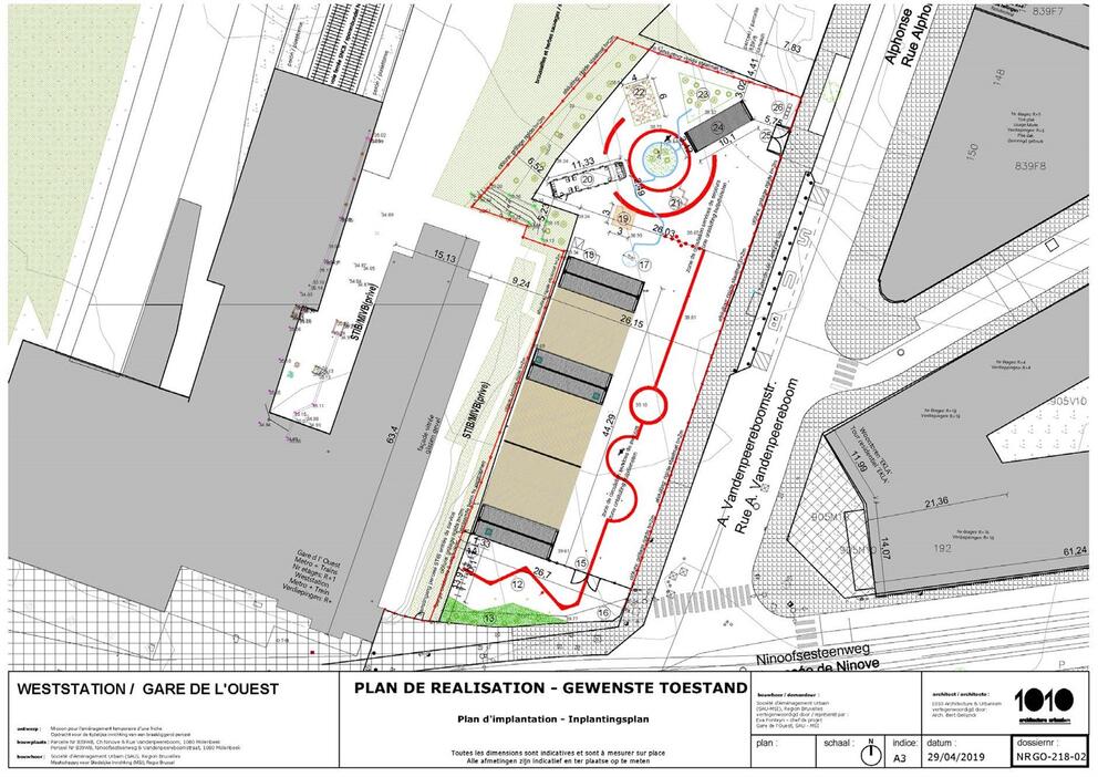 Ce terrain de 4.500 m2 est situé au coin de la chaussée de Ninove et de la rue Alphonse Vandenpeereboom, juste à côté de l’entrée de la station de métro Gare de l’Ouest. La Région planche sur la définition de sa future occupation définitive. En attendant, pour une période actuellement prévue pour trois ans, la Société d’Aménagement Urbain (SAU) et la commune de Molenbeek ont collaboré pour y permettre une occupation temporaire. Avec comme objectif de répondre à des besoins du quartier qui entoure cet important pôle de transports publics. Il a été décidé d’y aménager des espaces provisoires pour que les associations actives dans le quartier puissent y mener leurs activités, sur base du programme du Contrat de Quartier Durable « Autour du Parc de l'Ouest » et du diagnostic du Contrat de rénovation urbaine « Gare de l’Ouest » (CRU 3).