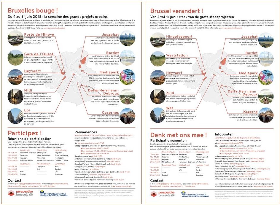 Dans ce cadre, perspective.brussels organise la « Semaine des grands projets urbains », du 4 au 11 juin prochains, pour présenter au public l’état des lieux et les grands enjeux des 10 premiers : Heyvaert, Porte de Ninove, mediapark.brussels, Gare de l’Ouest, Usquare.brussels, Josaphat, Delta-Herrmann-Debroux, Midi, Loi, Bordet.